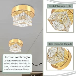 - Materiais: metal e cristal k9. - Dimensões do cristal CxLxA : 7 cm x 7 cm x 4,5 cm - Dimensões da base: Diâmetro: 12 cm Altura: 2,5 cm Compatível com caixinha de força 4x4 Altura total do plafon: 7,5 cm