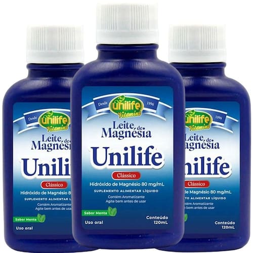 O Leite de Magnésia Sabor Menta 120ml Unilife Kit com 3 é um suplemento alimentar líquido. Composto por hidróxido de magnésio na concentração de 80mg/ml, esse produto é essencial para manter o equilíbrio e o bom funcionamento do seu corpo.