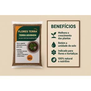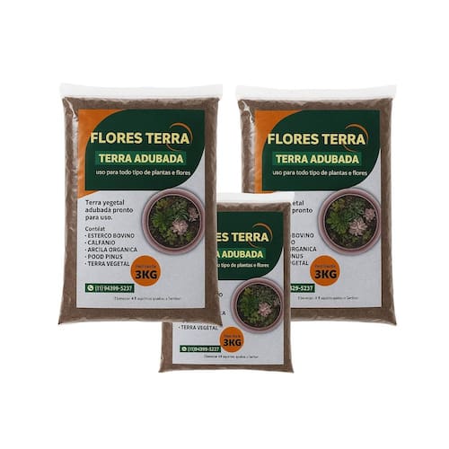Kit 3 Terra Adubada Flores Terra 3kg Cada - Plantas e Flores O Kit 3 de Terra Adubada Flores Terra contém sacos de 3kg cada, desenvolvido para todos os tipos de plantas e flores. É um produto pronto para uso, composto por esterco bovino, calcário, argila orgânica, pó de pinus e terra vegetal, garantindo um solo rico em nutrientes e com ótima retenção de umidade. Benefícios: