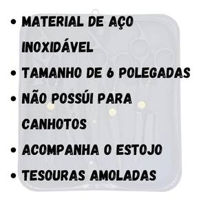Kit composto por: 1 Tesoura Fio Laser 6.0 polegadas 1 Tesoura Fio Navalha 6.0 polegadas 1 Tesoura Desfiadeira 6.0 polegadas 1 Navalhete 1 Estojo de material sintético. Para realizar um bom corte de cabelo, você precisa ter um equipamento apropriado, pois ninguém gosta de usar equipamentos que te deixam na mão ou então que mastigue o cabelo na hora de fazer o corte, por isso você precisa de tesouras que o ajude a fazer o trabalho direito para que o seu cliente goste de seu trabalho e volte mais vezes. Você precisa ter no mínimo tesouras de corte de cabelo profissionais com excelentes qualidades, com acabamento mais leves assim como essa, pois só quem já passou por esses problemas de não ter equipamentos adequados sabe o que é ficar frustrado. Por isso elas fazem toda a diferença no acabamento de um bom corte. O Material é de alta qualidade, durável para uso mais longo. É também anti-estático sem ferir ou mastigar o cabelo, especialmente para aquelas mulheres com cabelo longo e danificados. Kit acompanha um estojo de pequeno porte, fácil de ser carregado para qualquer lugar, compacto e leve Kit perfeito para quem deseja trabalhar com produto 100% novo e de alta qualidade Ferramentas ideias para cabeleireiros e barbeiros. do vendedor: 30 dias Marca: Não Informado Ean: 79056009373416