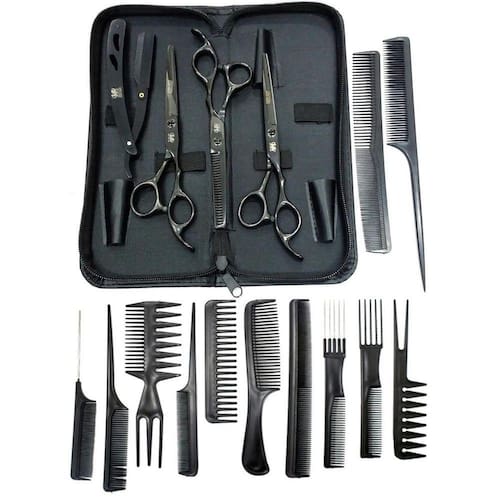 Kit perfeito para quem deseja trabalhar com produtos 100% novos e de alta qualidade Ferramentas ideais para cabeleireiros e barbeiros. Tesouras com acabamento mais leves e resistentes. Suas composições preservam o funcionamento e afiação das tesouras por mais tempo. A navalha é indicada para barbear, dar acabamento ou finalizar cortes.Especificações das tesouras:1 Tesoura Fio Navalha 6.0 polegadas1 Tesoura Desfiadeira 6.0 polegadas1 Tesoura Fio Laser 6.0 polegadas1 Navalha Para Lâmina Lisa1 Kit 10 Pentes Profissionais