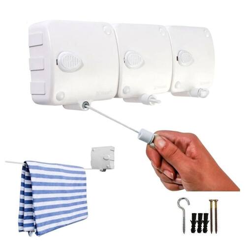 Kit 3 varal expansível retrátil automático com 6 metros modular O varal automático oferece uma solução conveniente e prática para secar suas roupas. Sua versão retrátil permite que você tenha uma extensão de corda de até 6 metros, oferecendo amplo espaço para pendurar suas roupas. Cada corda suporta até 6 kg de peso, garantindo que você possa secar várias peças de roupa de uma só vez.