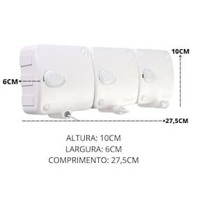 Kit 3 varal expansível retrátil automático com 6 metros modular O varal automático oferece uma solução conveniente e prática para secar suas roupas. Sua versão retrátil permite que você tenha uma extensão de corda de até 6 metros, oferecendo amplo espaço para pendurar suas roupas. Cada corda suporta até 6 kg de peso, garantindo que você possa secar várias peças de roupa de uma só vez.