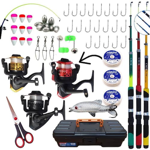 Kit acompanha: - 3 linha ja enrolada ao carretel- 3 vara para molinete telescópica cmik com passadores c.W 1,70m 12-20lbs- 3 molinetes taue sy200 ou cmik ht200 carregado com linha - 1 und tesoura aço inox 7 17cm - 1 isca artificial lambari- maleta- 2 und sino alerta- 15 und anzol pode ser nº 02, 06, 08 ou 10 - 10 und chumbada pode ser 1 5 ou 7 g - 3 und snap com girador- 3 und boia lamabari n 01- 3 und boia lamabari n 03- 3 und boia lamabari n 05 Especificações técnicas: VaraFabricante: cmikModelo: telescópicaMaterial: fibra de vidroUtilização: molineteTamanho: 1,70mPotência: leveTrês passadores + ponteiraMedida da vara recolhida e com o protetor de ponta 48,00 cmPeso: 105 gramasDisponível nas cores: verde / azul / vermelho / amarelo Molinete-marca: taue ou cmik- material do corpo: grafite- material do carretel: grafite- manivela: intercambiável direito ou esquerdo - knob: plástico - sistema anti - reverso- velocidade de recolhimento: 5.2:1- capacidade de linha: 0,18mm 245m / 0,20mm 200m / 0,25mm 125m- peso: 140 gramas Marca: Apolaz Sports