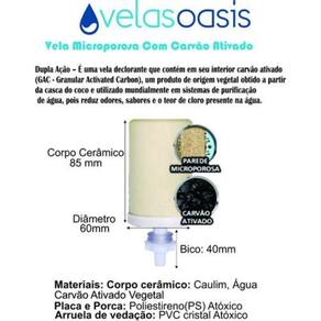 A vela oasis com carvão ativado são fabricadas com matéria-prima de primeira qualidade, queimadas em fornos elétricos a temperaturas elevadas, portanto não estão impregnadas com nenhum odor de combustíveis, madeiras e similares, sendo um produto de alta qualidade com todas as garantias de higiene, além de ser considerada uma das mais eficientes no tratamento da água. Sua parede em material cerâmico microporoso filtra a água por gravidade, sem adição de produtos químicos, reduzindo impurezas e retendo partículas sólidas, o que garante uma água saudável e livre de microorganismos, garantindo um fluxo de filtragem altamente satisfatório para seus consumos. As velas são compatíveis com todos os filtros por gravidade do mercado e, sem dúvida, não há meio mais seguro de oferecer água pura e garantir saúde e bem-estar. Benefícios: - retém partículas: 5 a 15 micra (classe c) - reduz o cloro 75% (classe a) - retira gostos, odores e reduz o cloro livre - retén micro partículas sólidas. Dimensões da vela: Altura do copo: 85 mm Altura total(com o bico): 120 mm Diâmetro: 60 mm. Itens inclusos: 3 vela para filtro com carvão ativado.