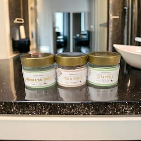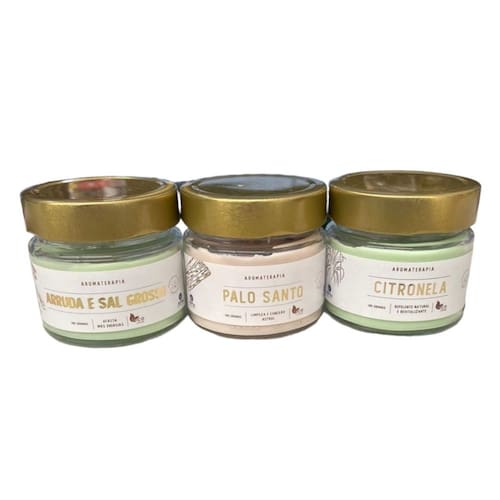 Contém 3 unidades: Aromas Arruda e Sal Grosso, Palo Santo e Citronela.