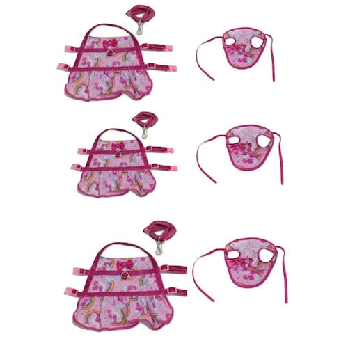 Kit com 3 vestidos peitorais com guia e 3 bonés Vestido confeccionado em tecido tricoline ou textoleen estampado na cor rosa ; Acabamento em viés rosa; Regulagem, fita de nylon com glitter rosa com presilhas de plastico; Laço na cor do rosa; Tamanho: 2 vestidos tamanhos P e 1 vestido tamanho M Medidas aproximadas: P 31 cm a 38 cm de circunferência abdominal, 30 cm de circunferência do pescoço, 22 cm de comprimento. M 34 cm a 40 cm de circunferência abdominal, 34 cm de circunferência do pescoço, 24 cm de comprimento.