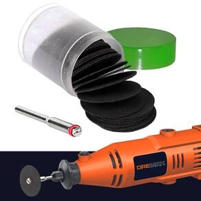 - Marca: Dremax - Kit com 30 discos de Corte + 1 Haste 3mm - Diâmetro do disco: 24mm - Velocidade Máxima: máxima: 35.000rpm - Material: Óxido de Alumínio - Espessura do corpo do disco: 0,8mm - Diâmetro do furo do disco: 2mm - Indicado para cortes em metais como aço, ferro, bronze, cobre, latão, alumínio. Também pode ser utilizado em plástico, acrílico e PVC - Para uso com micro retíficas Dremel, Black Decker, Charbs, Einhell, e qualquer outra marca - Uso hobby ou profissional - Peso: 90 gramas - Garantia: 90 dias contra defeitos de fabricação