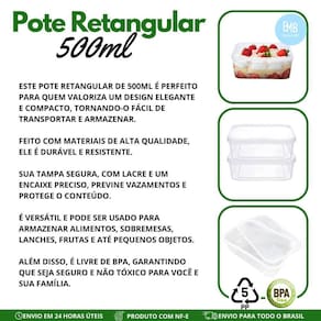 Na loja oficial embanet, apresentamos o pote retangular com lacre 500ml, projetado para simplificar sua rotina, preservar seus alimentos tornando sua vida mais prática.