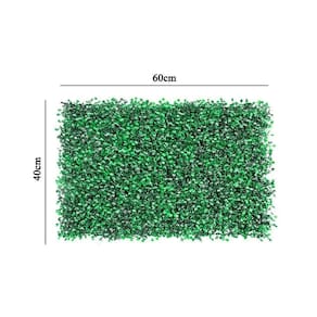Muro artificial do tipo grama buchinho; Cada placa tem 40cm x 60cm; Com encaixes que permite encaixar facilmente uma placa na outra; Peso aproximado: 350 gramas cada.