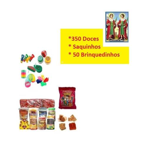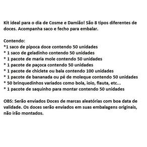 Contendo: 1 saco de pipoca doce contendo 50 unidades 1 saco de geladinho contendo 50 unidades 1 pacote de maria mole contendo 50 unidades 1 pacote de paçoca contendo 50 unidades 1 pacote de chiclete ou bala contendo 100 unidades 1 pacote de bananada ou pé de moleque contendo 50 unidades 50 brinquedinhos variados como bola, ioio, flauta, etc... 1 pacote de saquinho para montar contendo 50 unidades