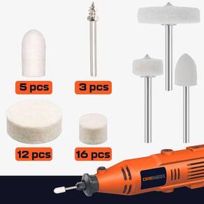 - Marca: Dremax - 5 Pontas de Feltro 20mm x 10mm - 12 Discos de Feltro 25,4mm x 6mm - 16 Discos de Feltro 12,7mm x 6mm - 3 Hastes para disco de feltro 3mm - Indicado para polimentos - Uso em micro retíficas de qualquer marca com pinça de 3mm - Para polir metais e plásticos em superfícies planas ou orifícios - Indicada para polimento de metais ferrosos ou não ferrosos, aço, aço inoxidável, alumínio, bronze, cobre, latão e plástico em geral - Para uso em conjunto com a haste para pontas de feltro - Garantia: 90 dias contra defeitos de fabricação