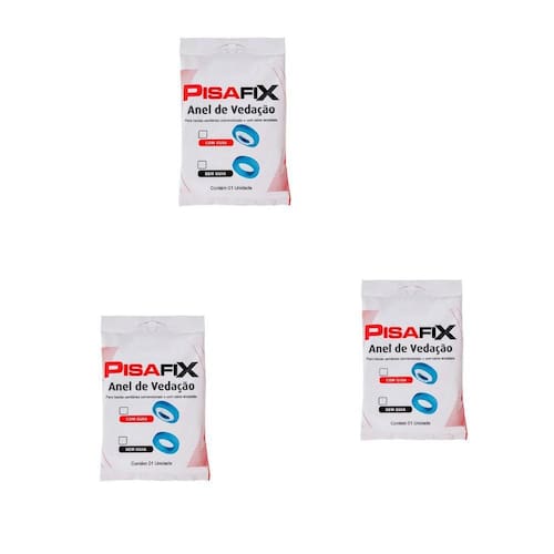 O Anel de Vedação Pisafix, é utilizado em bacias sanitárias para evitar vazamentos e eventuais odores de esgoto. Com a utilização desse produto, fica dispensado o uso de bolsa plástica ou massa de vidraceiro. Esse produto se caracteriza por ser uma massa pré-formada, adesiva, maleável, não secativa, com baixa solubilidade em água. É flexível, excelente durabilidade e estabilidade, à prova de vazamentos, antibacteriano, antifúngico, não encolhe, não deforma, não racha. Possui a opção com guia para facilitar a instalação. Kit CONTÉM 3UN.