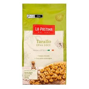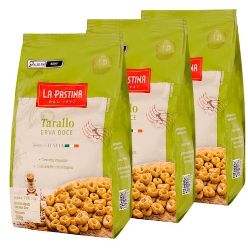 Produto: Biscoito Tarallo Erva-Doce LA PASTINA Kit com 3un . Peso Líquido: 200g por unidade. Total de Produto: 600g. Ingredientes: Farinha de trigo, azeite de oliva, erva-doce e sal. Origem: Itália. Conservação: Armazenar em local fresco e seco. Validade: Vide embalagem. Alérgicos: Contém glúten.