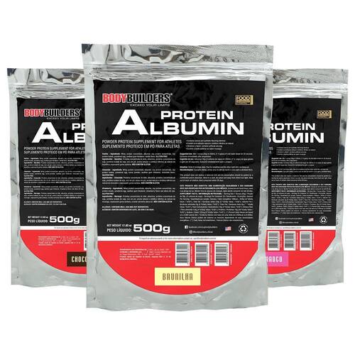 Kit 3X Albumina Protein 500G - Baunilha/Chocolate/Morango - BodybuildersPor possuir um alto valor biológico e todos os nutrientes que o corpo necessita, a albumina garante uma boa recuperação pós-treino e o auxilio no ganho de massa muscular. A Albumin Protein Bodybuilders foi desenvolvida para atender a uma variedade de dietas e estilos de vida. Elaborada com alto valor biológico e todos os aminoácidos essenciais que seu corpo necessita para uma boa recuperação, a albumina garante nutrientes indispensáveis no processo de recuperação pós-treino e no ganho de massa muscular. Esse suporte nutricional possibilita uma melhora na recuperação muscular, na síntese proteica, na manutenção da massa muscular e no aumento de força.Isento de registro - RCD 27/2010 ANVISA .