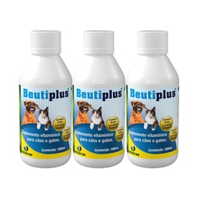 Kit 3x Beutiplus 180ml Indubras Suplemento Para Cães E Gatos Suplemento vitamínico para cães e gatos. Indicações Suplemento nutricional, composto de ácidos graxos essenciais ômega 3 e ômega 6 e vitaminas A e E, destinado a alimentação de cães e gatos em todas as suas fases de desenvolvimento, para manutenção de uma pele saudável com pelos brilhantes e sedosos. Níveis de por quilograma do produto Vitamina A Mínimo 150.000 UI/L Vitamina E Mínimo 600 UI/L Acido linoleico Ômega 6 Mínimo 425 g/L Acido linolênico Ômega 3 Mínimo 35 g/L Lecitina de soja Mínimo 20 g/L Modo de usar Administrar via oral, diretamente na boca do animal ou misturado ao alimento, 1 mL do produto para cada kg de peso corporal ao dia, independente da idade do animal. A dosagem máxima para animais acima de 60 kg é de 60 mL por dia. Alterações nas dosagens poderão ser feitas a critério do médico veterinário responsável. Apresentações Frascos contendo 180 mL Marca: Não Informado