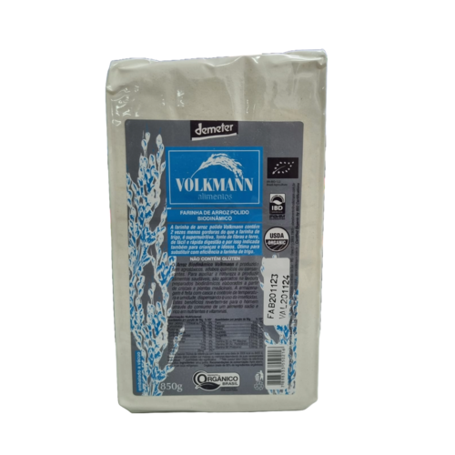 A Farinha de Arroz Polido Orgânico Biodinâmico Demeter Volkmann é uma farinha produzida com o grão composto somente do endosperma. Esta farinha possui sabor neutro e poucos nutrientes.