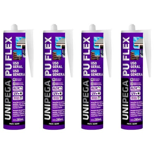 Obtenha resultados profissionais e duradouros com o Kit com 4 Unidades do Selante PU Flex Uso Geral Preto 280ml Unipega. Proporcione vedação de qualidade e resistência em todos os seus projetos de reforma e construção.