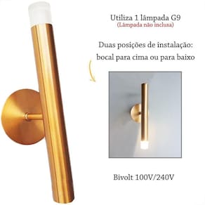 Que tal iluminar o seu ambiente com elegância e sutileza, além de otimizar bem o espaço da sua sala, quarto, corredor... O lup78 é a arandela que você procura, a sua cor em dourado e o seu design minimalista se encaixam muito bem em quase todos os tipos de ambientes internos. Podendo ser instalada com o bocal para cima ou para baixo. Difusor em acrílico jateado, proporcionando iluminação difusa e agradável. Neste kit contem 04 arandelas lup58.Descrição:- Materiais: Acrílico jateado e Alumínio Estrutura: Alumínio Difusor: Acrílico jateado- Cor: Estrutura: Dourado Difusor: Transparente- Medidas: Estrutura: 20 cm Profundidade: 8 cm Altura do Difusor: 2,4 cm Altura total da arandela: 22,4 cm Base ou canopla que fixa na parede : 8 cmAltura da canopla: 1,5 cm - Voltagem: 100-240V- Soquete para 1 lâmpada G9 Lâmpada não inclusa