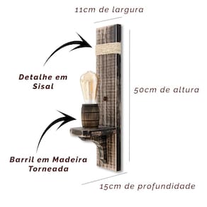 Apenas uso Interno O produto não pode ficar exposta ao sol e chuva Fabricada em Madeira Maciça; Detalhes em Corda de Sisal; Soquete: E27; Dimensões: 50cm de altura x 11cm de largura x 15cm de profundidade;