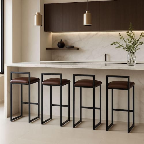 O assento em corino, além de elegante, oferece toque macio e fácil limpeza, tornando o dia a dia mais prático sem abrir mão do estilo. O design minimalista, com linhas retas e proporções equilibradas, se adapta perfeitamente a cozinhas gourmet, áreas de lazer e espaços corporativos modernos.