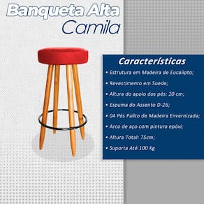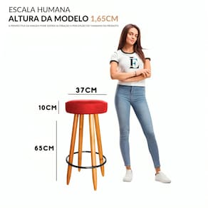 Características do Produto: - Base do assento e fundo Mdf e Mdp de 15MM; - Altura para apoio dos pés: 20 cm; - Altura do Assento: 10 cm; - Parte inferior acabamento em TNT preto; - Estrutura em madeira de eucalipto; - Arco em aço, com pintura especial epóxi; - Suporta uma pessoa até 100 kg; - Garantia 3 meses por nós fabricantes; - Formato Redondo; - Espuma do Assento D-23; - 4 Pés Palito Retrô; - 4 Chapas de Aço Galvanizado para fixação dos pés; Dimensões do produto montado: - Altura: 75 cm; - Largura: 37 cm; - Comprimento: 37 cm; Observações importantes: Para assegurar que sua banqueta mantenha sua durabilidade e beleza ao longo do tempo, siga estas recomendações: 1 - Limpeza: Use pano úmido com sabão neutro, evitando abrasivos. 2 - Proteção Solar: Evite sol direto para prevenir desgaste. 3 - Umidade: Seque imediatamente em caso de derrames. 4 - Uso Adequado: Respeite a capacidade de peso indicada e não faça movimentos perigosos em cima da banqueta. 5 - Manutenção: Inspecione periodicamente e limpe conforme instruções acima. 6 - Armazenamento: Local limpo e seco, protegido de poeira e umidade, não expor ao sol e chuva.