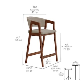 CARACTERÍSTICAS TÉCNICAS: - Produzido em Madeira Maciça; - Acabamento Verniz na Cor Pinhão; - Assento com Espuma D26; - Encosto com Espuma D23; - Revestido em Tecido Suede na Cor Bege.