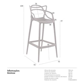 Banqueta Allegra: Material: Polipropileno - Altura do encosto: 109 cm - Altura do assento: 77 cm - Largura do assento: 35 cm - Profundidade do assento: 38 cm - Distância entre os apoios de braços: 50 cm - Distância entre os pés: 51 cm - Peso suportado: 120 kg - Garantia: 3 meses.