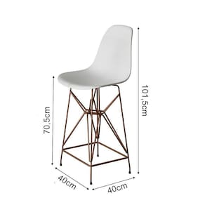Kit 4 Banquetas Bistrô Alta Eames Branca Base Ferro CobreA Banqueta Bistrô Alta Eames além de possui um design moderno, traz um toque extra de charme na decoração do seu ambiente. Feita com material de qualidade proporciona conforto e harmonia para receber convidados com estilo. Possui uma curvatura ergonômica que se encaixa perfeitamente ao corpo.Tipo: BanquetaModelo: Eames BistrôCor do Assento: BrancoCor da Base: CobreQuantidade: 4 BanquetasCARACTERÍSTICASBase: FerroAssento: Plástico polipropilenoDIMENSÕES DO PRODUTOAltura: 101,5cmAltura assento até o chão: 70,5cmLargura: 40cmComprimento: 40cmIMAGENS MERAMENTE ILUSTRATIVAS, PODENDO HAVER UMA PEQUENA VARIAÇÃO NA COR DEPENDENDO DE CADA TELA OU MONITOR.Kit 4 Banquetas Bistrà Alta Eames Branca Base Ferro Cobre