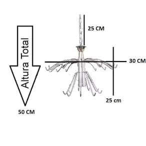 especificações do produto: Base: redonda com 2 andares Cor da base: prata ou dourada escolha no momento da compra Diâmetro: 30 cm Altura total: 50 cm 25 cm do corpo + 25 cm de corrente ajustável Peso: 549g Soquete: 1x e-27 em porcelana compatível com lâmpadas led, comuns ou econômicas Voltagem: bivolt 110v ou 220v Fiação: anti-chama, conforme exigência do inmetro Instalação: enviado totalmente montado e pronto para instalar Pode ser instalado diretamente no teto, com ou sem o uso da corrente.