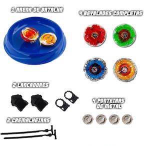 Kit Explosivo com 4 Beyblades - Batalha Iluminada Prepare-se para duelos épicos com o Kit de 4 Beyblades que vai turbinar as suas batalhas Com duas Beyblades iluminadas por LEDs e duas clássicas de alta performance, a diversão está garantida para crianças e adultos que adoram ação e velocidade O que vem no kit: 2 Beyblades com luz de LED - Vire a estrela da arena com peões que brilham durante a batalha 2 Beyblades clássicas - Velocidade e poder para vencer qualquer desafio 2 Lançadores poderosos - Para girar com força total e detonar na arena 4 Ponteiras de metal - Garantindo equilíbrio e resistência nas batalhas mais intensas 2 Chaves de regulagem - Ajuste sua estratégia e deixe suas Beyblades imbatíveis 1 Arena de Plástico - Disponível nas cores Azul ou Vermelho, sem opção de escolha. 2 Cremalheiras - Potencialize seus lançamentos e supere seus oponentes Cores - Cada Beyblade é uma surpresa cheia de estilo Por que escolher este kit Desafie seus amigos em batalhas iluminadas e cheias de ação As luzes de LED deixam as competições ainda mais emocionantes, e com duas chaves de regulagem, você pode ajustar as Beyblades para a vitória certa Diversão Garantida Indicado para crianças acima de 3 anos contém peças pequenas , esse kit é perfeito para reunir a família e descobrir quem é o verdadeiro mestre das Beyblades Acenda a emoção, desafie seus amigos e domine a arena Adquira agora o Kit Explosivo com 4 Beyblades e entre na batalha com estilo Homologação Inmetro: ABCP-BRI-0243-2021-04 Marca: Não Informado Ean: 9812903209999