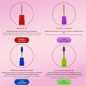 F Flame S(F) 720: Formato de chama e corte fino é ideal para remover gel próximo à cutícula sem agredir a unha natural. Oferece precisão e controle, sendo ótima para trabalhos de refinamento e para limpar áreas de difícil acesso.? F Gold Umbrella: Ponta em formato de guarda-chuva e acabamento dourado, entregando alta durabilidade e resistência. Seu design permite levantar suavemente as cutículas e remover camadas finas de gel ou acrílico ao redor das áreas próximas à pele, com precisão e sem causar desconforto.? C Colourful Bullet ST: Ideal para detalhes delicados. O formato Bullet é ótimo para alcançar áreas pequenas e precisas, tornando-a perfeita para remover material entre as dobras laterais das unhas ou trabalhar em áreas próximas às cutículas. O acabamento colorido facilita a identificação e também agrega estilo à ferramenta.