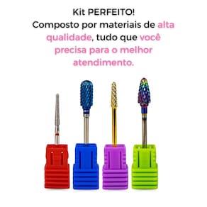 Características Principais: - Cortes Extra Finos, Finos, Médio e Grosso; - Kit com 4 Unidades; - Modelo Flame S (F) 720; - Modelo F Gold Umbrella; - Modelo C Colourful Bullet ST; - Modelo M Blue Large Barrel Ball ST; - Ideal para todas as áreas e processos; - Não danifica as unhas naturais; - Perfeita para alongamentos de unhas, e acabamentos; - Garante precisão; - Acabamentos detalhados.
