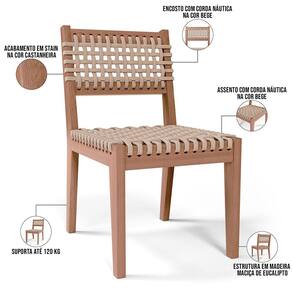 O Kit 4 Cadeiras Madeira Maciça Para Cozinha Corda Náutica Giardino G01 Castanheira Bege, da Lyam Decor, combina design moderno com durabilidade e funcionalidade. Com sua intricada tecelagem de corda náutica e estrutura maciça de madeira de eucalipto, essa cadeira de madeira é perfeita para uso interno e externo, seja na cozinha, varanda ou área de entretenimento. Seu design adiciona um toque de elegância a qualquer espaço, enquanto a construção robusta garante qualidade duradoura. Dê um upgrade na sua experiência gastronómica com a Cadeira de Madeira Maciça Giardino. Adicione agora mesmo ao seu carrinho e surpreenda-se!