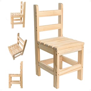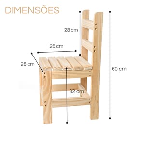 Descrição Técnica: Kit com 4 Cadeiras Cadeira Infantil De Madeira Super Resistente Até 80 Kg. Feita de madeira de PINUS TRATADO, garantindo durabilidade e segurança. Assento ripado para máximo conforto. Acabamento natural, sem pintura, ressaltando a beleza da madeira. Medidas: 60x32x28cm (altura x profundidade x largura). Altura do assento até o chão: 32cm. Faça parte desta jornada de crescimento e diversão ao lado dos seus filhos. Não perca tempo e garanta já o seu Banquinho Kids - um tesouro que acompanhará sua família por muitos e muitos anos.