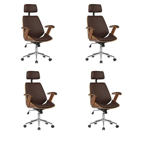 Cadeira office giratória com ajuste de altura e função relax. Estrutura em madeira nogueira compensada, estofada e revestida em Poliuretano. Possui base estrela cromada e rodízios em nylon. Altura do Conjunto: 124 cm Ambiente: null Ambiente Principal: Escritório Cor: Marrom Cor do Produto: Marrom Informação Complementar: 4x Cadeira de Escritório Presidente Giratória com Apoia Cabeça Office Lisboa Marrom Largura: 63 cm Altura: 124 cm Peso: 15 kg Profundidade: 61 cm Necessita Montagem: Sim