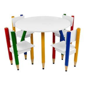 Kit 4 Cadeiras E Mesa Infantil Lápis Coloridos Redonda Tampo Branco Pés Temáticos Quarto Menina Menino Mobília Decor Conjunto Mesinha Redonda Pé Lápis + 4 Cadeiras Pé Lápis Conjunto infantil colorido e resistente com mesa redonda 80x80 cm e quatro cadeiras com pés em formato de lápis nas cores amarelo, verde, vermelho e azul, ideal para atividades, leitura e brincadeiras em quartos, brinquedotecas e escolinhas.? Mesa: 56 cm de altura; 80 x 80 cm; 6,2 kg; suporta até 10 kg; tampo em MDF/madeira com pintura tinta e interno Branco TX; pés sextavados tipo lápis em eucalipto com fixação por chapinha metálica; sem rodízios, portas ou puxadores.?