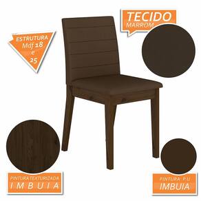 Detalhes Técnicos das Cadeiras: - Acabamento da Cadeira: Assento e Encosto Tapeçados - Almofada do Assento: Fixa - Cadeira Estofada: Sim - Peso Suportado da Cadeira: 90 KG - Facilidade da Montagem: Medial - Tonalidade da estrutura da Cadeira: Imbuia - Tonalidade do Tecido: Suede Marrom - Assento: D16 - Encosto: D14 - Tipo de Pintura: UV Texturizada - Material da Estrutura: MDF 25mm e 18mm - Medida da Cadeira: 92CM x 44CM x 50CM