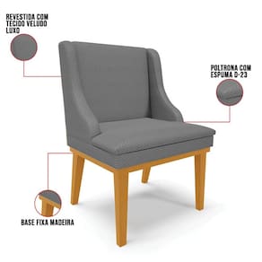 A Cadeira Lia é produzida em Madeira Eucalipto ecologicamente correta e a base fixa de madeira suporta até 120 kg, sem impacto. Seu estofamento é composto por espuma macia densidade D-23 e revestida em Veludo, tecido clássico, elegante, resistente, confortável e de toque macio.