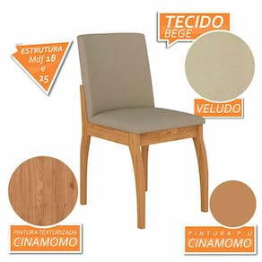Kit 4 Cadeiras Sucre Possuem um ótimo tamanho e contam com encosto e assento estofados, um material de extrema qualidade e durabilidade e garante um toque agradável e macio.Detalhes Técnicos das Cadeiras:- Acabamento da Cadeira: Pintura com Assento e Encosto Tapeçados- Almofada do Assento: Fixa- Cadeira Estofada: Sim- Peso Suportado da Cadeira: 90 KG- Facilidade da Montagem: Média - Deve ser montada por um Profissional- Tonalidade da estrutura da Cadeira: Cinamomo- Tonalidade do Tecido: Veludo Bege- Espuma do Assento: D 23- Espuma do Encosto: D 16- Tipo de Pintura: UV Texturizada- Material da Estrutura: MDF 25mm e 18mm- Medida da Cadeira: 87CM x 46CM x 63CMConteúdo da Embalagem:- 04 Cadeiras- Plástico protetor- Acessório para MontagemObservações Importantes- As imagens ambientadas são meramente ilustrativas e podem apresentar itens que não incorporam o produto;- Todos os nossos produtos são novos, acompanham documento fiscal e possuem garantia de 3 meses, essa garantia cobre somente defeitos de fabricação;- A entrega só será efetuada no endereço do CEP, caso o endereço seja diferente do CEP informado no pedido, a entrega terá cobrança adicional e o comprador arcará com as despesas;- Não realizamos entregas para zonas rurais, via caminhos fluviais e distritos, por isso não aceitamos CEP GERAL da região;- Não é possível realizar o agendamento de entrega do produto, é necessário que acompanhe o rastreio de seu pedido para saber a previsão de entrega;- As entregas somente serão realizadas para um responsável maior de idade (+18);- Enviamos para diversos estados, sendo assim nossas entregas são realizadas por transportadoras parceiras de nossa empresa. Confira as dimensões antes da compra e certifique-se de que o produto passará por elevadores, portas e corredores já que nossa entrega não inclui a subida de lances de escada, transporte por elevador e o lançamento de produtos, em caso de condomínios residenciais a entrega é feita somente até a portaria. Todas as entregas são realizadas em dias e horários comerciais;- Ao receber os seus produtos observe se a embalagem se encontra em perfeitas condições. Se você adquiriu algum móvel, confira atentamente a quantidade de volumes e o aspecto físico das embalagens. Confira também se a cor do móvel está de acordo com o seu pedido;- O prazo de cancelamento por arrependimento é de até 7 dias corridos a contar da data de recebimento;- Os produtos e assistências são enviados DESMONTADOS, MONTAGENS E DESMONTAGENS recomendamos sempre a contratação de um montador profissional e é válido lembrar que o custo desses serviços é por conta do comprador;- Objetos decorativos que aparecem na foto não acompanham o produto;- Evitar a exposição direta à luz solar e à umidade;- Para limpeza, limpar com pano macio e seco, não utilizar qualquer outro tipo de produtos químicos;- As cores do produto podem variar de acordo com o monitor, a iluminação do ambiente ou sua percepção visual.