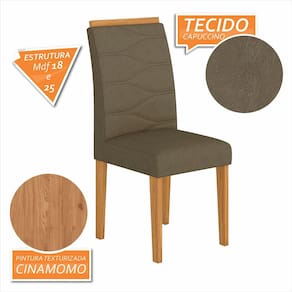 Detalhes Técnicos das Cadeiras -Assento e Encosto Tapeçados, Estofados e Fixos -Cadeira suporta até 90KG -Facilidade da Montagem:Média -Tonalidade Cadeira:Cinamomo/Suede Capuccino -Espuma Assento:D23 -Espuma Encosto:D16 -Pintura UV Texturizada -Material Estrutura:MDF 25mm/18mm -Medida da Cadeira:100CMx44CMx50CM