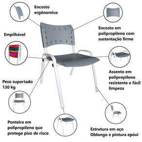 Estrutura em aço com pintura epóxi eletrostática na cor preta, assento e encosto fabricados com polipropileno de alta resistência garantindo qualidade e durabilidade do produto, permitindo ser utilizada em área externa.
