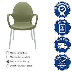 - Sofisticação e conforto que transformam seu ambiente! - A Cadeira Tramontina Grace une design moderno, durabilidade excepcional e conforto com estilo. - Feita em polipropileno resistente, ela é perfeita para quem busca praticidade sem abrir mão da elegância. - Com braços ergonômicos e acabamento verde oliva, é ideal para compor salas, varandas ou áreas gourmet com requinte e personalidade. - Tenha agora o toque de sofisticação que seu espaço merece!