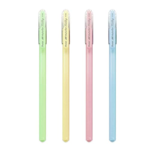 Kit 4 Caneta Gel Hybrid Milk 0.8mm Tom Pastel Pentel Especificações: -1.0 mm aproximadamente - Cor variavel conforme o angulo de visão e cor do papel, cores diferentes no papel branco e preto - Corpo Fino - Quantidade: 6 cores