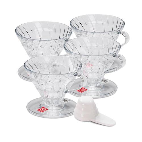 Kit 4 Coadores De Café Em Acrílico Transparente Hario V60-01 Prepare um saboroso café para você e suas visitas com o inovador Kit de 4 Coadores de Café em Acrílico Transparente Hario V60-01. - Kit composto por 4 coadores Hario - Coadores Hario do tipo V60-01 tamanho 01 - 4 Colheres de plástico inclusas Ean: 2960002296710