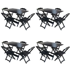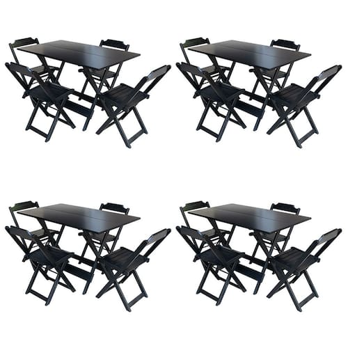 Kit 4 Conjuntos De Mesa Com 4 Cadeiras De Madeira Dobravel 120x70 Preto é ideal para bares, restaurantes, estabelecimentos, áreas de lazer e tambem para sua casa. Feito em madeira maciça, tornando resistentes e duráveis. Seu design permite que seja encaixado em qualquer ambiente, trazendo um toque a mais para seu estabelecimento. Além de sua durabilidade, o que lhe trará conforto para servir seus clientes. Por ser dobrável torna-se mais fácil guardar, manusear e limpar o produto. Atenção: EVITE USAR PRODUTOS ABRASIVOS E QUíMICOS PARA LIMPEZA DO PRODUTO, aconselha-se o uso de pano umedecido para melhor conservação; mantenha o produto fora de chuva e sol constantes MESA Cor: Preto Modelo: Dobravel Dimensões: Altura 75cm | Largura 70cm | Profundidade 120cm CADEIRA Cor: Preto Modelo: Dobravel Dimensões: Altura 80cm | Largura 45cm | Profundidade 42cm