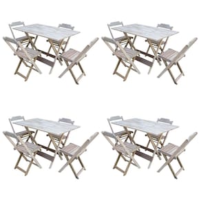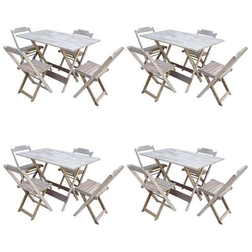 Kit 4 Jogos De Mesa Com 4 Cadeiras De Madeira Dobravel 120x70 Ideal Para Bar E Restaurante - Sem Pintura/Crua é ideal para bares, restaurantes, estabelecimentos, áreas de lazer e tambem para sua casa. Feito em madeira maciça, tornando resistentes e duráveis. Seu design permite que seja encaixado em qualquer ambiente, trazendo um toque a mais para seu estabelecimento. Além de sua durabilidade, o que lhe trará conforto para servir seus clientes. Por ser dobrável torna-se mais fácil guardar, manusear e limpar o produto. Atenção: EVITE USAR PRODUTOS ABRASIVOS E QUíMICOS PARA LIMPEZA DO PRODUTO, aconselha-se o uso de pano umedecido para melhor conservação; mantenha o produto fora de chuva e sol constantes MESA Cor: Sem Pintura / Crua Modelo: Dobravel Dimensões: Altura 75 | Largura 70 | Profundidade 120 CADEIRA Cor: Sem Pintura / Crua Modelo: Dobravel Dimensões: Altura 80 | Largura 45 | Profundidade 42