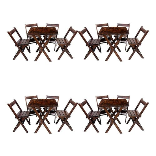 AS IMAGENS SÃO MERAMENTE ILUSTRATIVAS E PODEM SOFRER VARIAÇÕES DE COR E PEQUENOS DETALHES DE ACORDO COM O SEU MONITOR, ILUMINAÇÃO DO AMBIENTE E ATÉ MESMO A SUA PERCEPÇÃO VISUAL.Kit 4 Conjuntos Mesa DobrÃvel 70x70cm Para Bar Com 4 Cadeiras Em Madeira MaciÃa - Imbuia