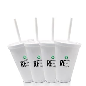 Kit eco com copos com tampa e canudo eco personalizados para ajudar o meio ambiente. Adote o seu copo e evite descartáveis. Juntos somos mais fortes. Confira as opções de copos, taças e canecas ecológicas personalizadas. Especificações: Material: Acrílico PS Altura: 14,5 cm Diâmetro: 9,5 cm Capacidade: 550 ml Cor: Branco Quantidade: 4 peças Ean: 7897581915488