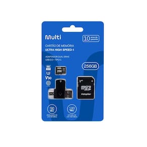 Marca: Multi Modelo: Kit 4 em 1 Cartão de Memória 256GB Ultra High Speed-I U3 + Adptador USB/OTG Tipo C + Adaptador SD - MC154 Cor: Preto Memória: 256GB Velocidade de Gravação: 90 MB/s Velocidade de Leitura: 100MB/s Dimensões -LxAxC-: 9 x 0.05 x 14.5cm Peso: 14g Garantia: 10 anos